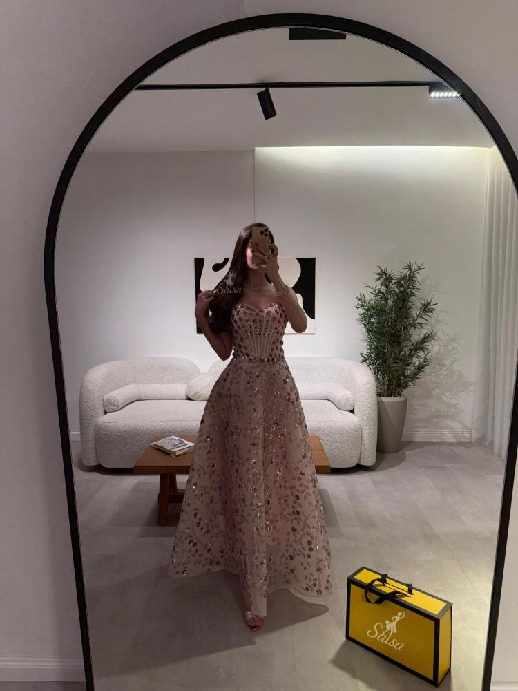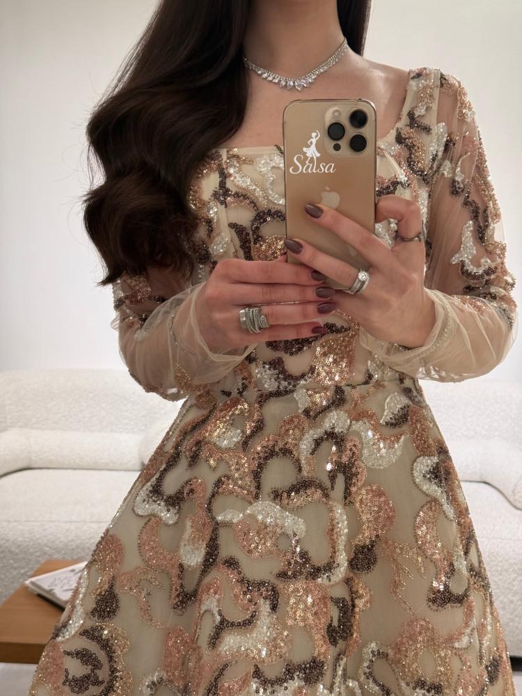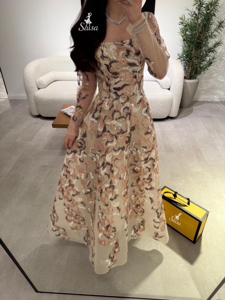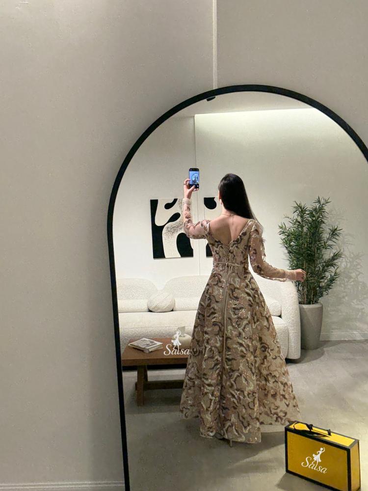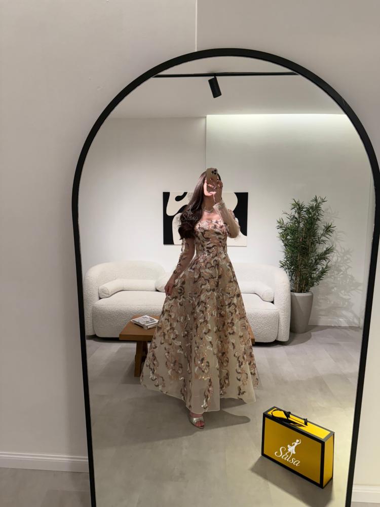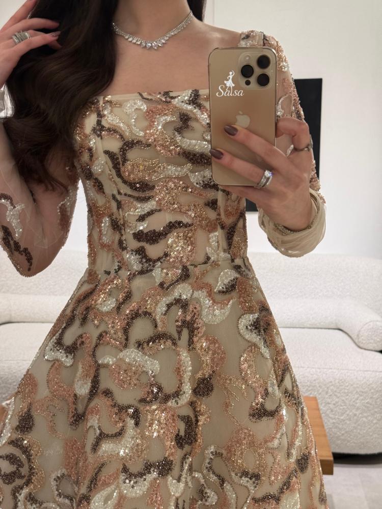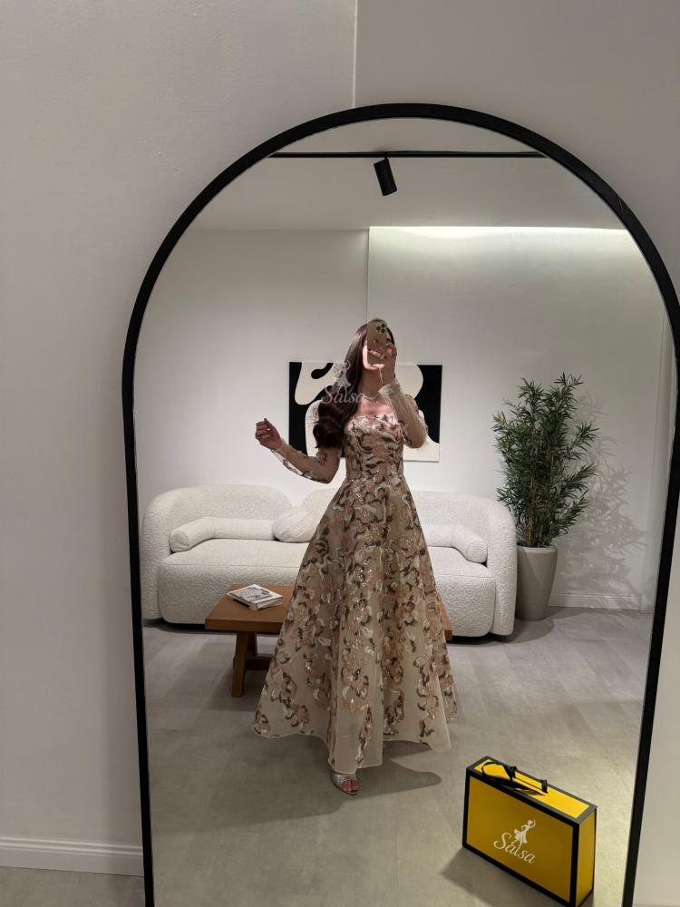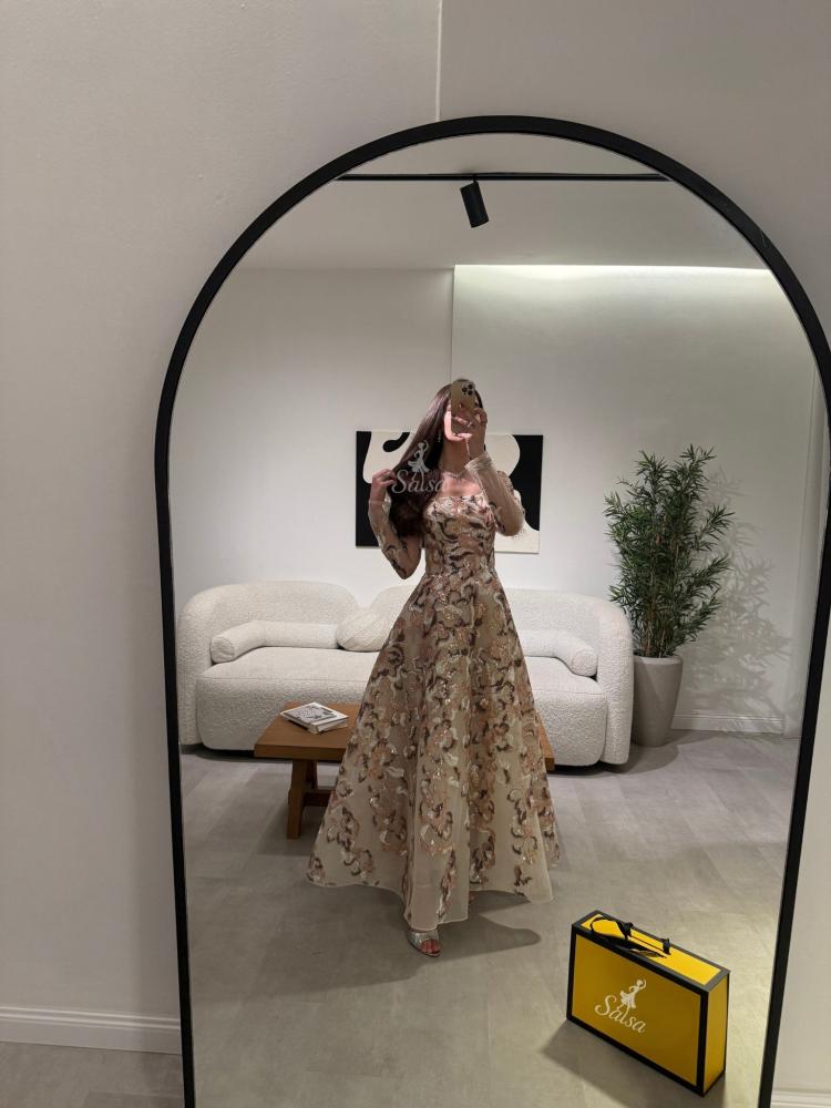يتميز بتصميم كورسيه فرنسي واقف وأكمام طويله يمنح قواماً أنثوياً ممشوقاً وإطلالة ملكية آسرة.